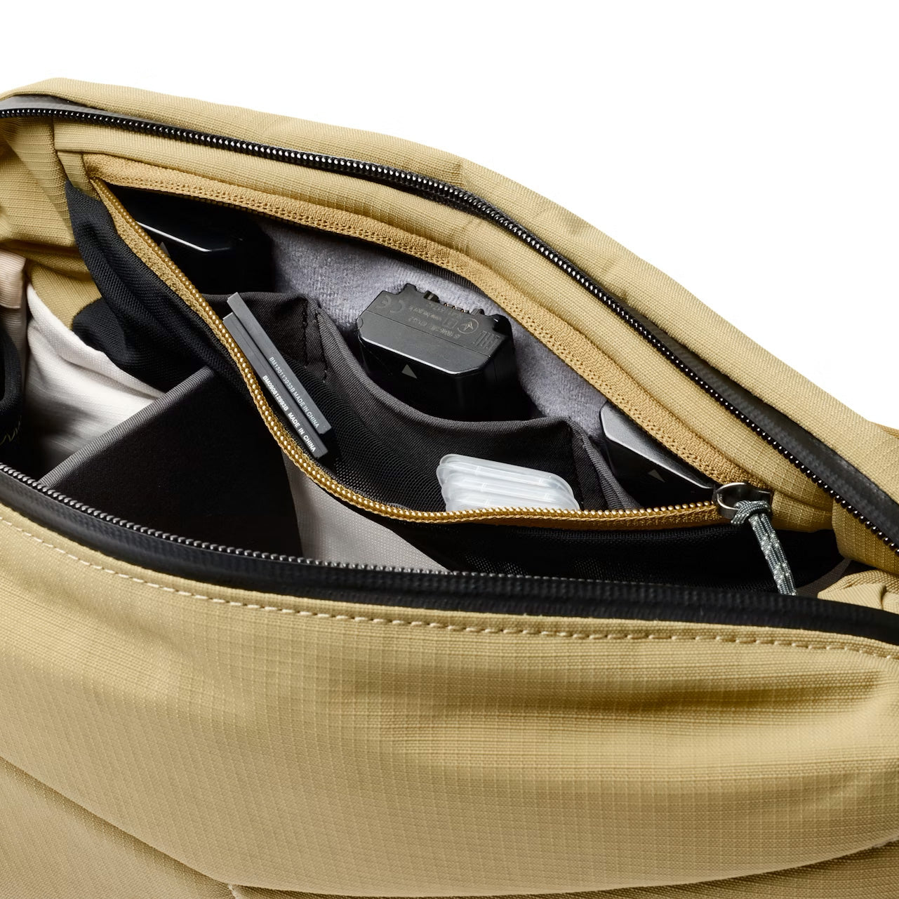 - Mykfôret nettingglidelåslomme med dedikert oppbevaring for 3 batterier