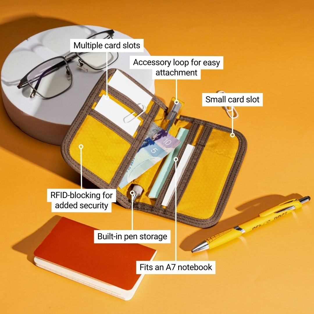 - Kan holde flere kort, kontanter, en A7-notatbok og en penn