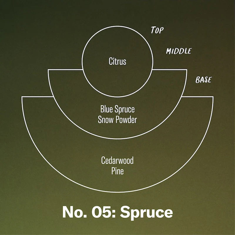 No.05 Spruce (limited edition) «Dense forest floor, sunshine and snow, corner tree lots. Snow powder, blue spruce, cedarwood, and citrus.»