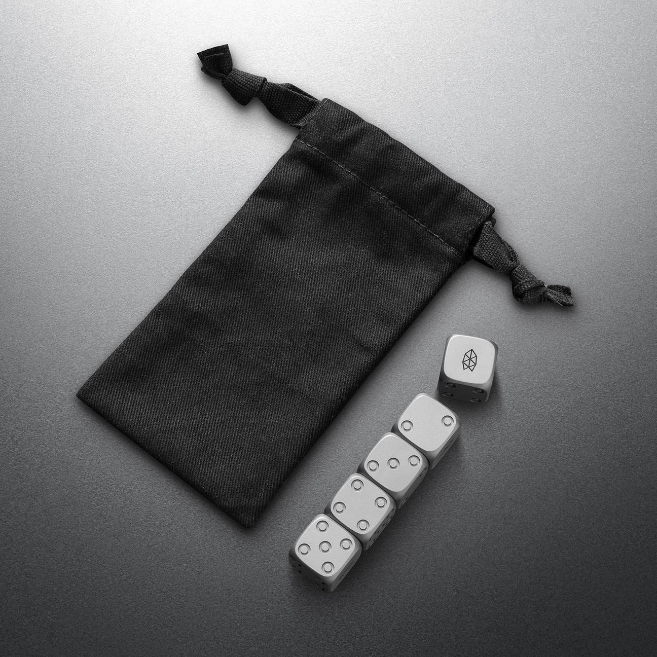 Et eksklusiv sett på fem terninger i 6Al‑4V titan med presisjonsmaskinerte indekser og en sofistikert finish — laget for både spill og stil.